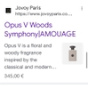 Thông qua một “bản giao hưởng của rừng” được cân bằng tốt, Opus V Woods Symphony khơi gợi kiến thức có thể đánh lừa và biến đổi như thế nào. Những nốt hương hoa và sáp của Orris Absolute, bơ và kim loại của Orris Concrete do Dry Woods đẩy lên, và làn khói nồng nặc của rượu Rhum vẽ nên một thế giới nhị phân của các con số đen trắng, mảnh thủy tinh và dữ liệu vo ve đằng sau bàn kim loại trong khi thú tính thô sơ của Oud còn Cầy hương và mùi thơm thoang thoảng của Hoa hồng và Hoa nhài đang héo tàn gợi lên mùi hương của con người, cùng chung sống với máy móc.