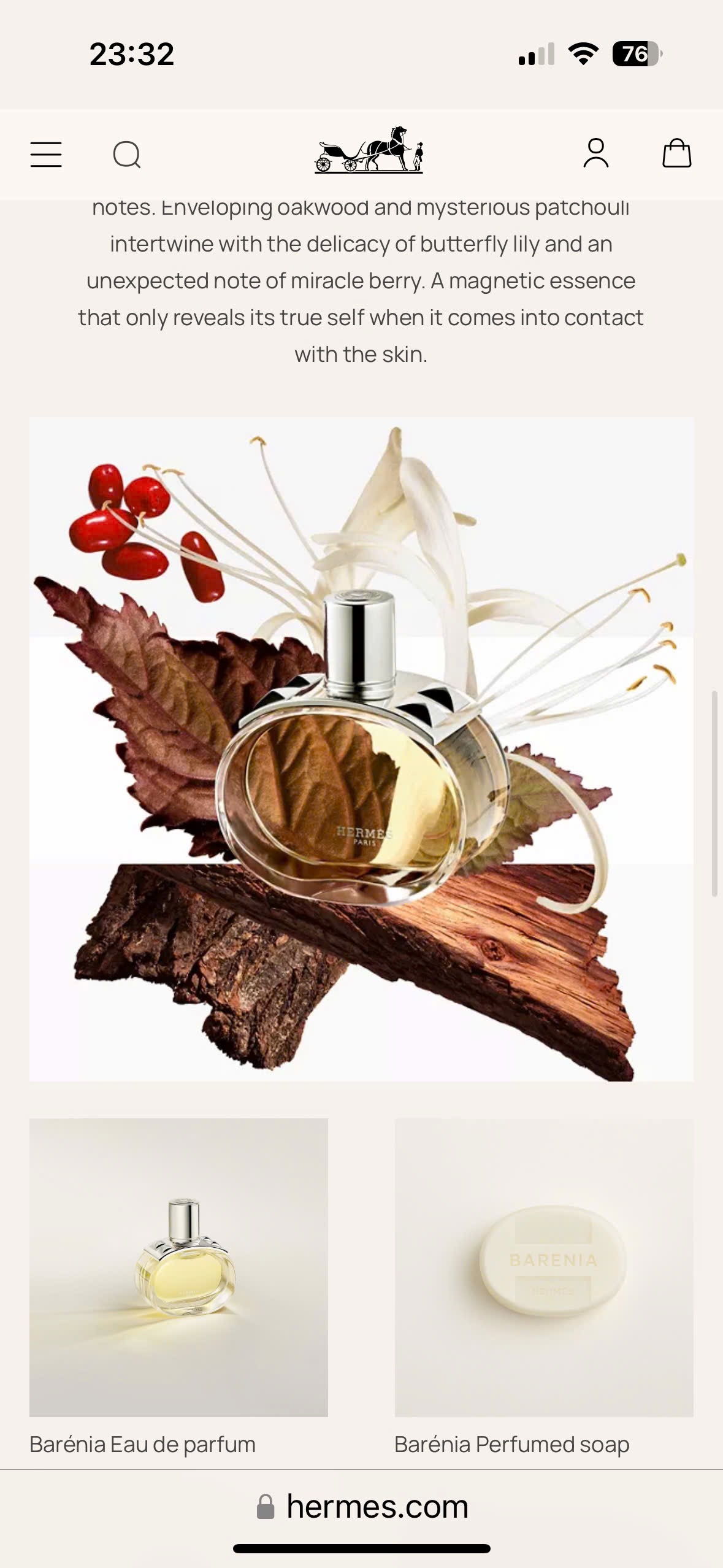 Barénia của Hermès là một hương thơm chypre được tạo ra bởi Christine Nagel. Hương nước hoa này kết hợp hoa lily quyến rũ với quả mọng tinh tế, được bao bọc trong các nốt hương gỗ sồi và hoắc hương sâu. Nó thể hiện tính cách của một người phụ nữ bản năng và hấp dẫn, thể hiện sự tự do.