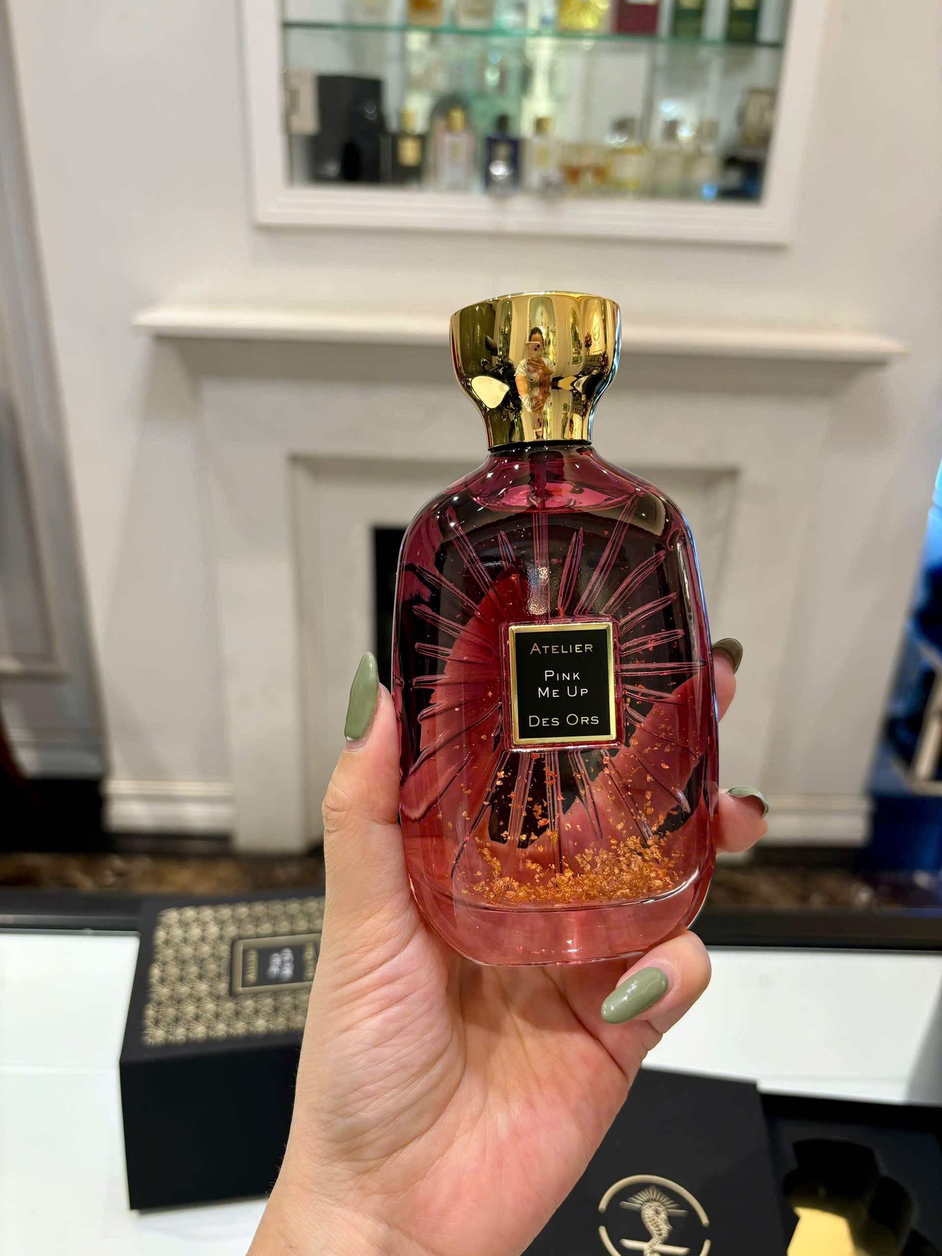 Với thiết kế đơn giản, tuyệt đẹp nhưng không kém phần tinh tế, chai nước hoa Atelier Des Ors Pink Me Up thủy tinh chứa đựng chất lỏng hồng đượm cùng những lá vàng “bay” lấp lánh đã gây chú ý đặc biệt ngay từ phút đầu khi nhìn thấy. Hình thức Pink Me Up toả sáng song hành cùng hương thơm sống động và giàu cảm hứng.