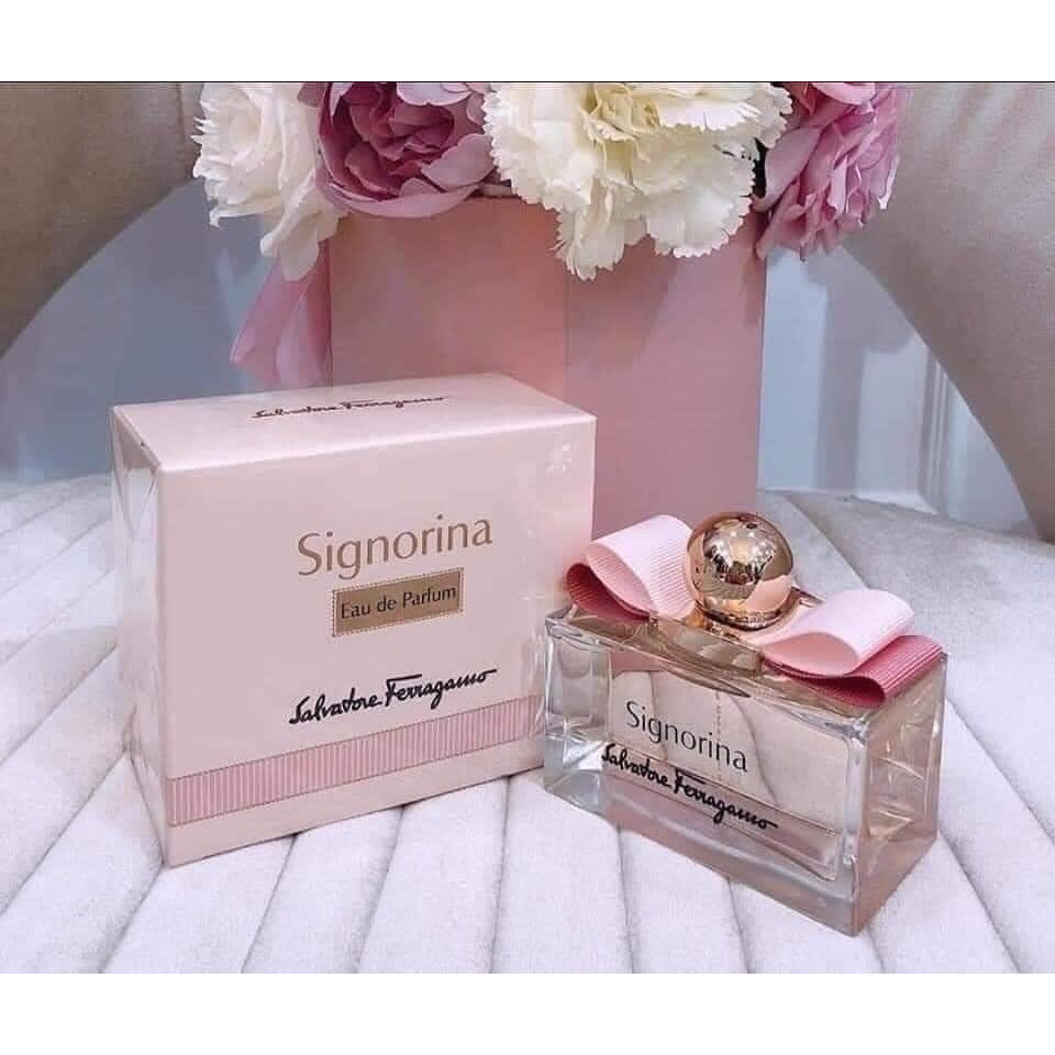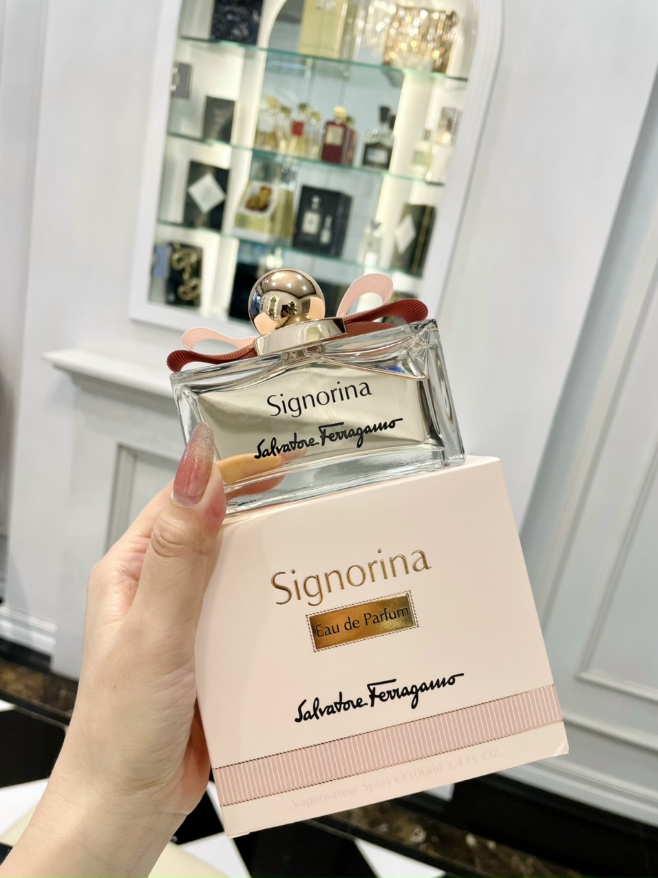 Signorina trong tiếng Ý mang nghĩa là người phụ nữ trẻ. Nước hoa Signorina là sự tôn vinh những cô nàng cá tính với mùi hương tươi mát, sành điệu và phảng phất nét táo bạo. Đây là mẫu nước hoa mới của thương hiệu Salvatore Ferragamo, hướng đến những cô gái trẻ với sự kết hợp của tinh dầu hoa nhài, nho đen, mẫu đơn, hoắc hương và hoa hồng mang phong cách Italy.